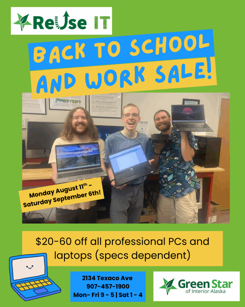 School is right around the corner which means it is time for our Reuse IT store’s Back to School and Work Sale! Come on in for $20-60 off all professional PCs and laptops depending on the system. Our refurbished system’s prices are already low but this sale makes them even more affordable!