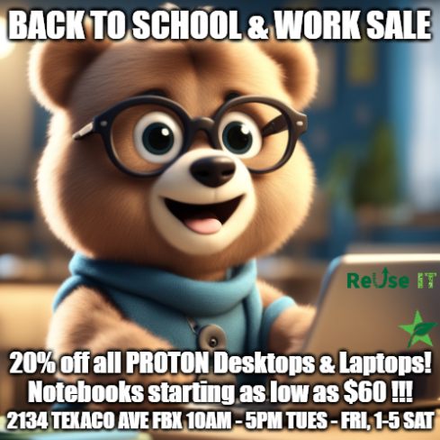 Our ReUse IT computer resale store is having a back to school sale offering 20% off all Proton desktop and laptop computers. Come in to 2134 Texaco Ave. any time Tue-Fri 10-5 or Sat 1-5. We have a great selection and the prices start at just $60!