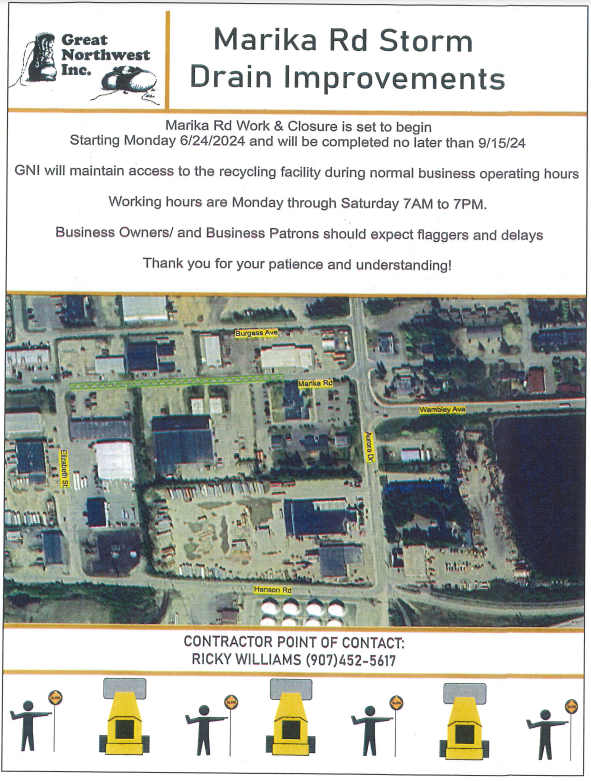 While the Storm Drain Improvements to Marika Road begin on Monday, June 24th the CRF will remain open during construction. Expect to see flaggers and some delays getting into and out of the CRF. Construction may last into September, so plan for a little longer trips than usual to the CRF for the rest of the summer.