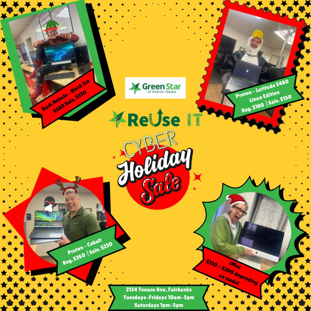 Looking for affordable electronic gifts for the family this holiday season? Skip the big box store and come on down to Green Star ReUse IT Store at 2134 Texaco Ave in Fairbanks off of Van Horn! We have refurbished laptops, computers and gaming computers for sale from November 25th through December 28. All of our electronics were donated to the FNSB Central Recycling Facility and have been expertly wiped and refurbished.