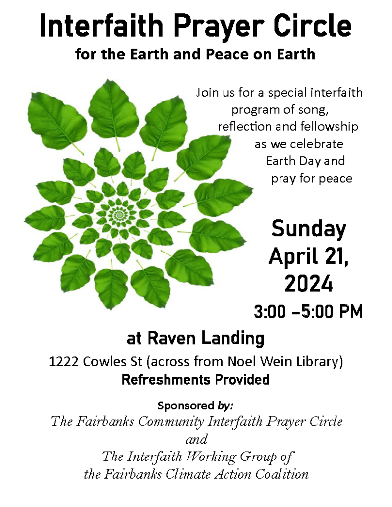 Earth Day 2024 Join the public FB group for events, notifications, schedules and more! https://www.facebook.com/groups/earthdayfairbanks/ Art and Poetry Walk entries due by April 12th: https://fb.me/e/7e7UWIwaa https://fb.me/e/7Pn0mlooJ https://fb.me/e/3CEqVpYgmhttps://fb.me/e/3CEqVpYgm Share this: Share on Facebook (Opens in new window) Facebook Share on X (Opens in new window) X Share on X (Opens in new window) X Share on Threads (Opens in new window) Threads