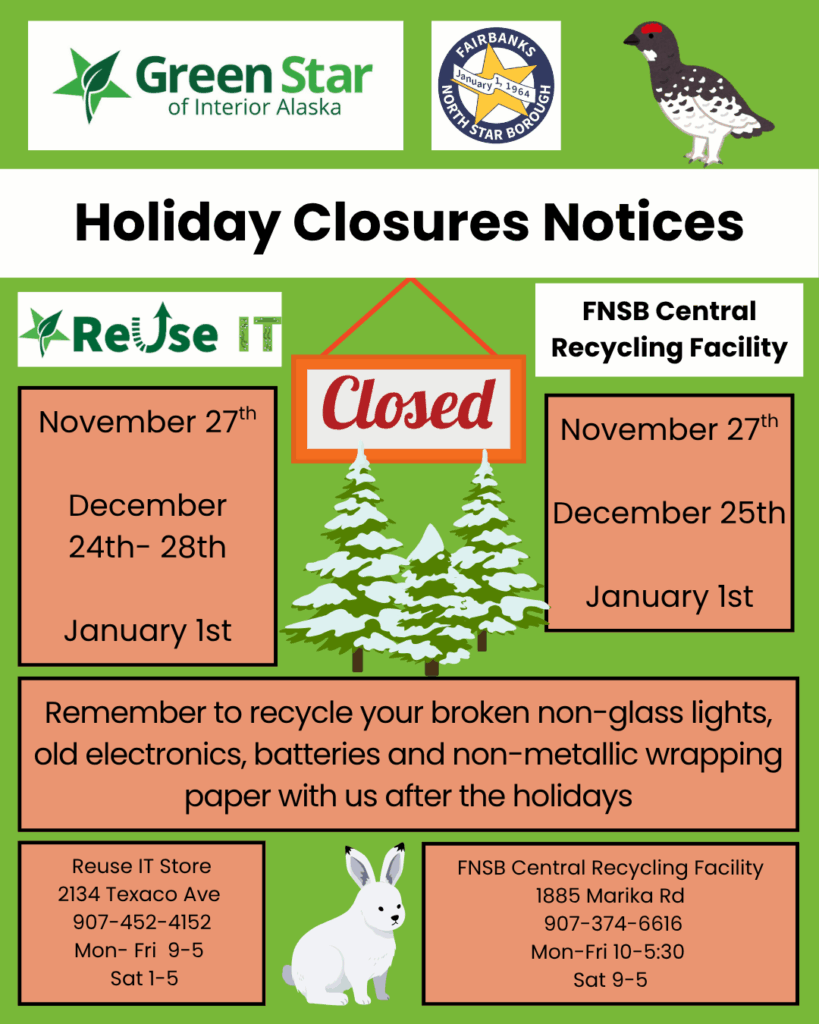 The winter holiday season is coming up fast! The FNSB Central Recycling Facility (CRF) and our Reuse IT store closed next Thursday November 27th for our staff to have time off with their families. Both will reopen for normal business hours on Friday November 28th!