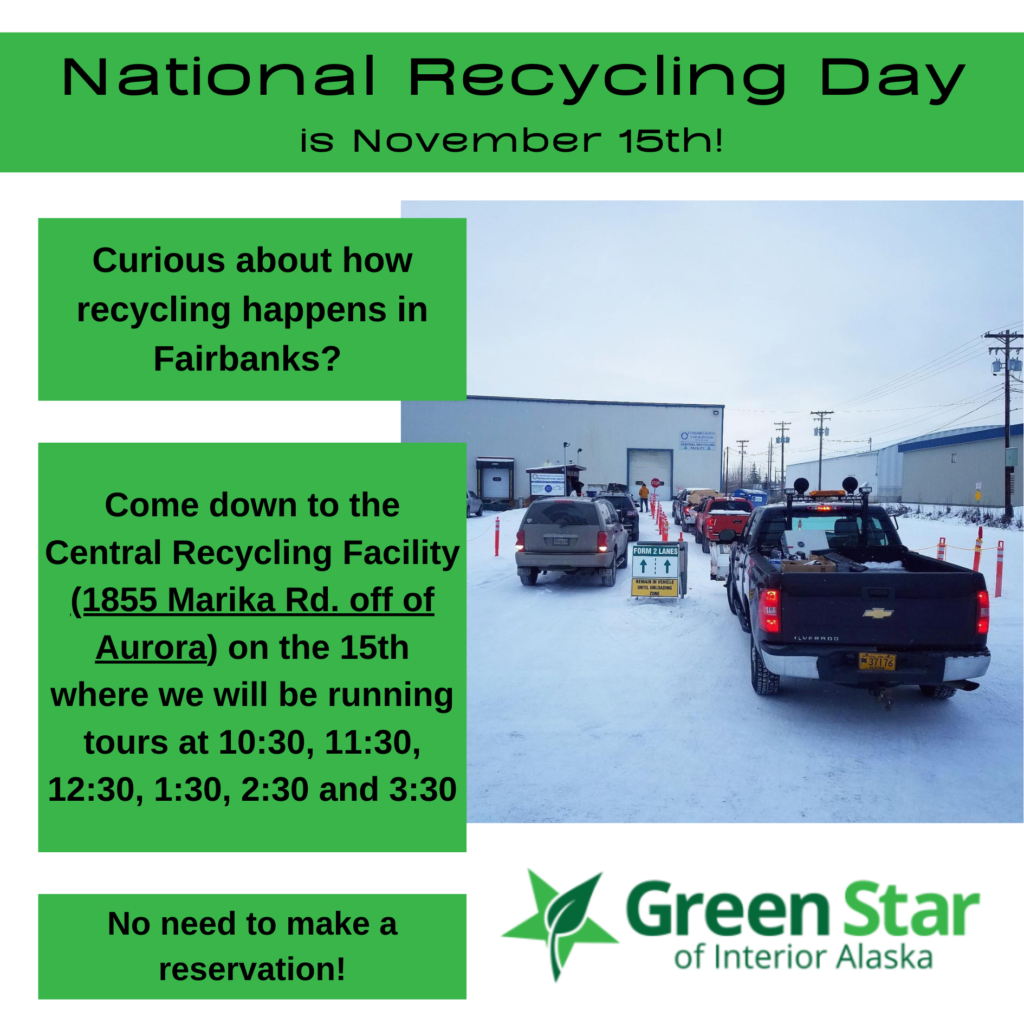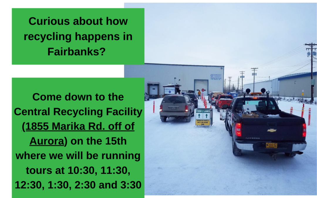 November 15th is National Recycling Day! We will be running tours out of the Central Recycling Facility (1855 Marika Rd. off of Aurora) every hour on the half hour starting at 10:30 and ending 3:30 on November 15th.