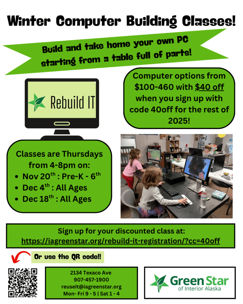 Our Reuse IT store’s Rebuild IT Computer Building Classes are $40 off for the rest of 2025! We have a class coming up this Thursday and December 4th and 18th! Give yourself or your kid the early holiday present of building their own computer!