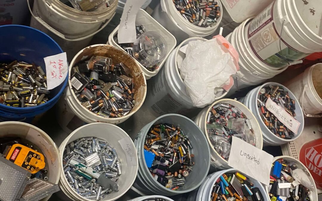 Batteries turned into the FNSB CRF are weighed and then taken to Green Star’s Electronics Warehouse to be sorted. Each battery has to be shipped in a container where all the batteries have the same chemistry, so our volunteers sort them three times by chemistry. The lithium and tool batteries are then taped to prevent accidental discharge per our downstream recycler.