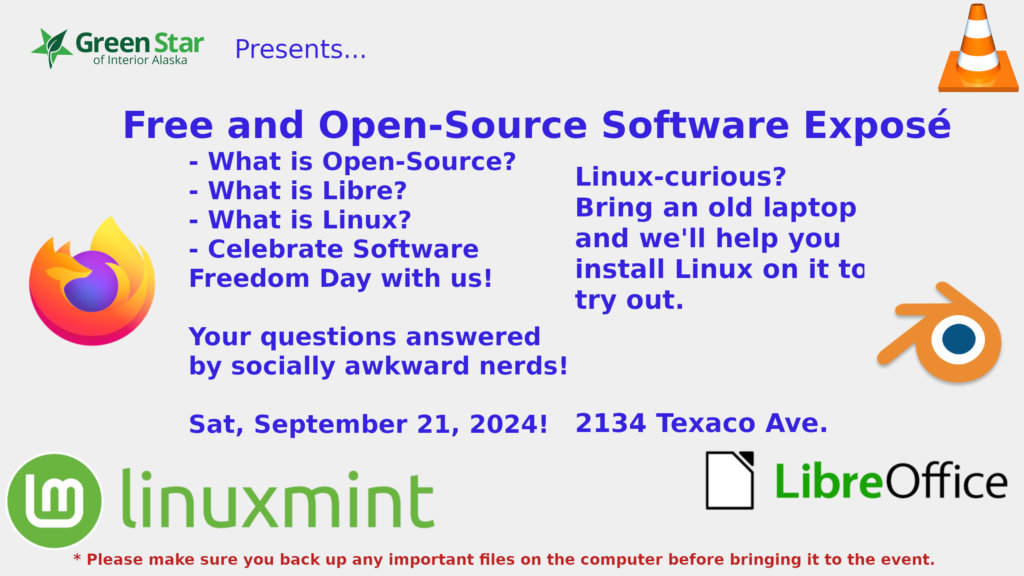 If you are just curious or just have questions about what open source solutions look like and run like, but do not have a spare laptop, or don’t want to install an OS or OSS applications on your device, you are welcome to come play with some of ours. No computer is required to come to the event.