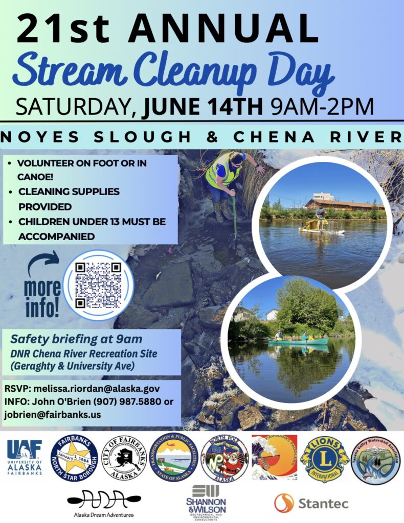 Also every year multiple organizations and government divisions put on a Stream Cleanup Day to clean Noyes Slough and the Chena River! Stream Cleanup Day is now one month away!