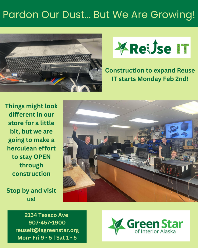 Our Reuse IT store at 2134 Texaco Ave is going to look a little different in February… we are expanding! We will be open throughout construction but please pardon our dust and roll with us as our staff works hard to still repair your computers and keep our inventory up.